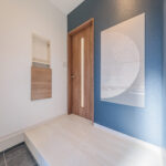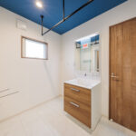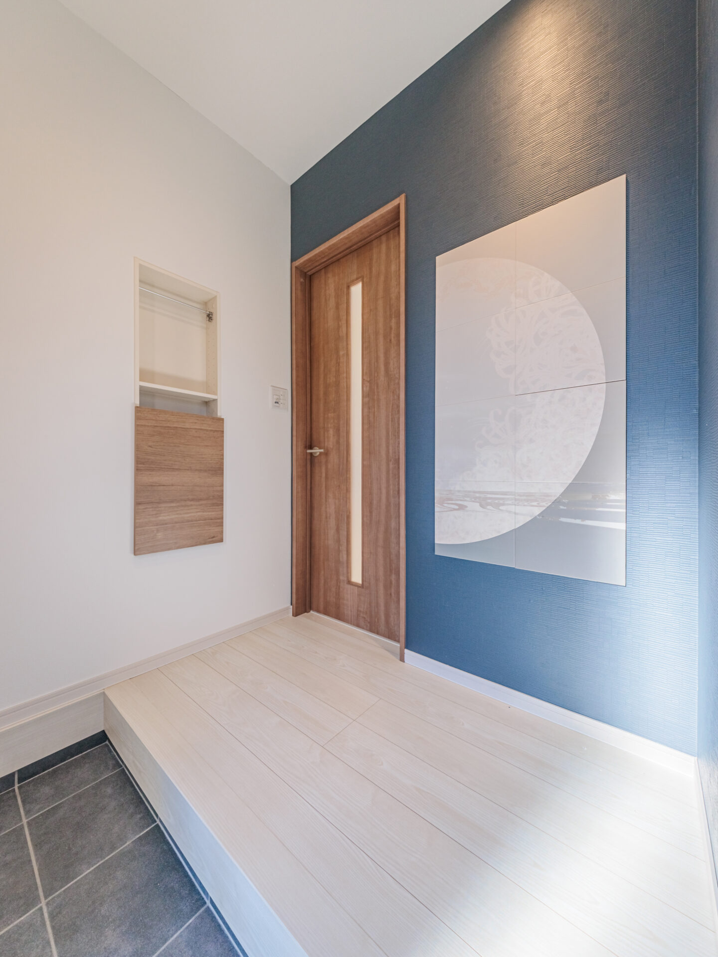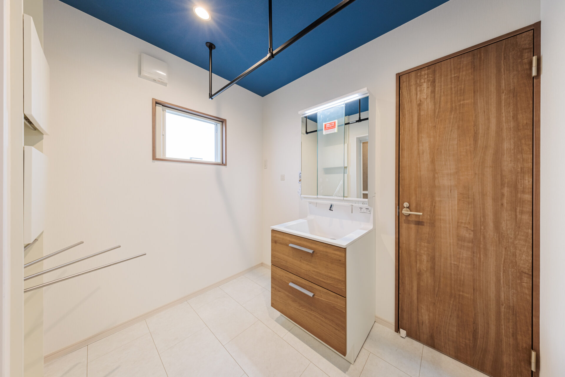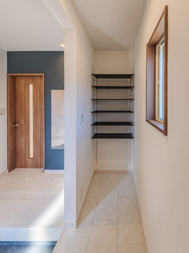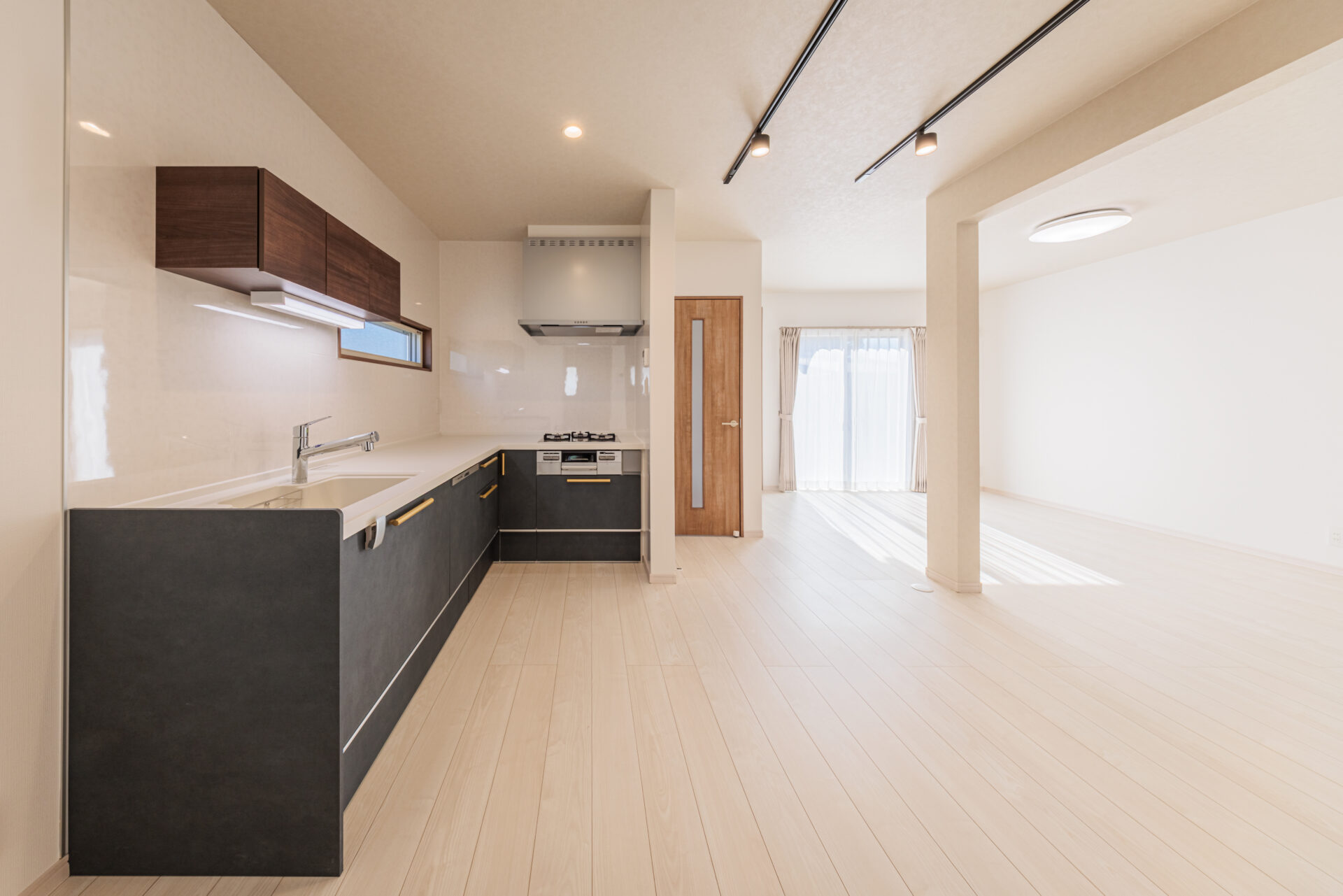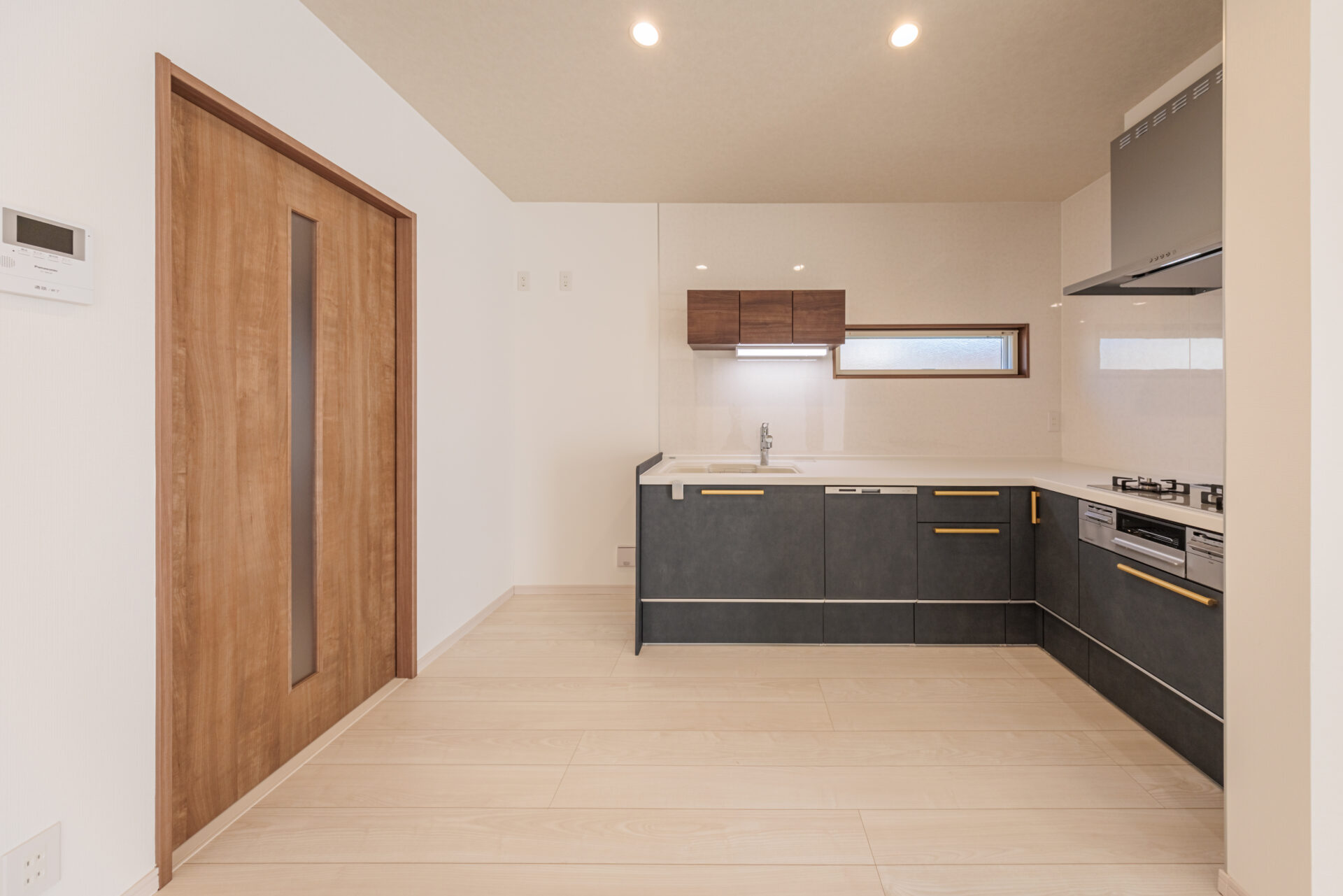 同じ壁付けでもL字型にすることで広い調理スペースに。ネイビのカラーが部屋全体のカラーコーディネートのポイントです。
